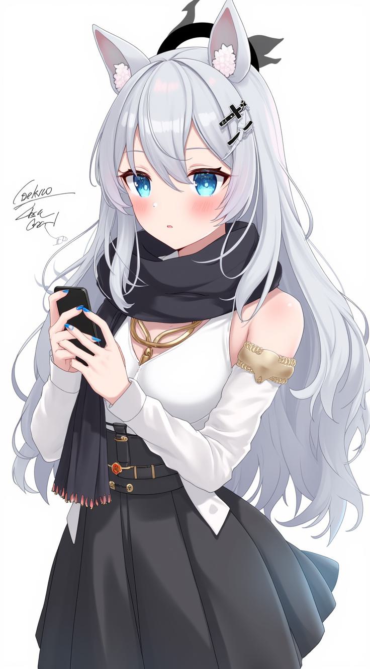 1girl, alternate costume, animal ear fluff, animal ears, bag, bare shoulders, black halo, black scarf, black skirt, blue eyes, blue nails, blush, breasts, cellphone, closed mouth, cross hair ornament, dark halo, earrings, extra ears, grey hair, hair between eyes, hair ornament, halo, handbag, holding, holding bag, holding phone, jewelry, large breasts, long hair, long skirt, long sleeves, looking down, mismatched pupils, nail polish, off shoulder, phone, scarf, shiroko \(blue archive\), shiroko terror \(blue archive\), shirt, skirt, smartphone, solo, very long hair, wolf ears