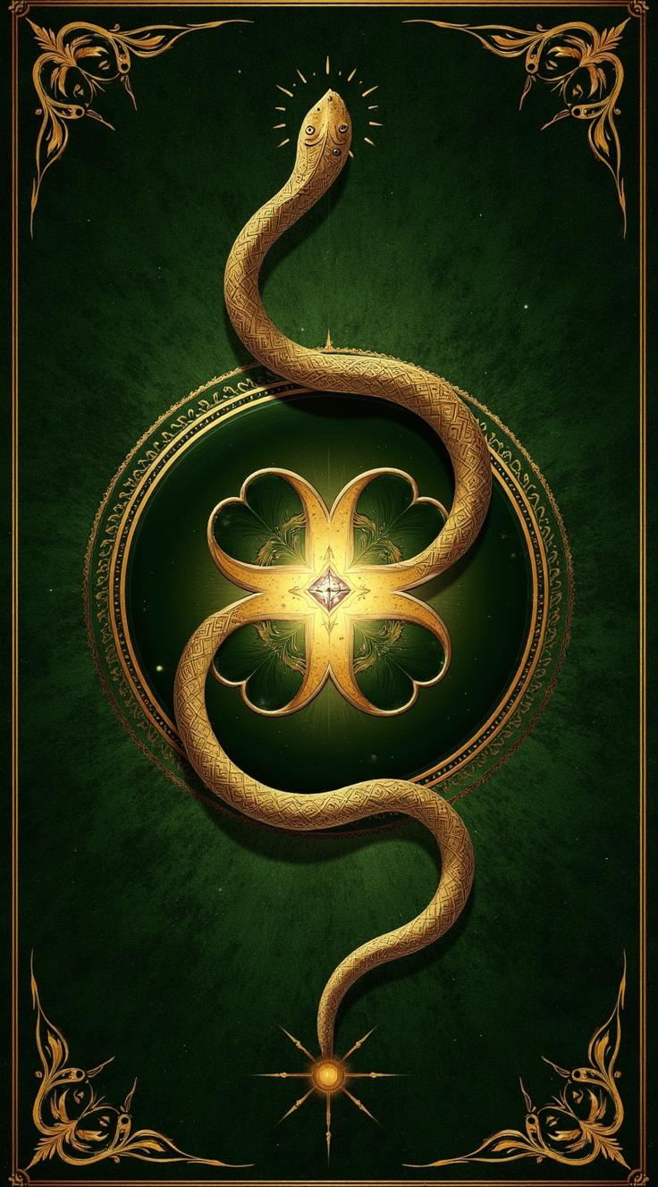 Представь мистическую сцену: золотая змея, словно ожившая из древних легенд, бережно обвивает магический четырёхлистный клевер — символ удачи. Клевер сияет, как драгоценный камень, в его центре пульсирует бриллиант. Тёмно-зелёный фон и золотые орнаменты создают атмосферу древнего амулета. Вокруг композиции — россыпь мелких клеверов и изумрудов, будто зачарованных магией. Стиль — смесь ар-деко и фэнтези, с акцентом на блеск и загадочность.
