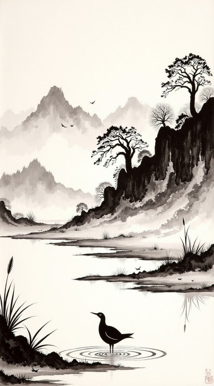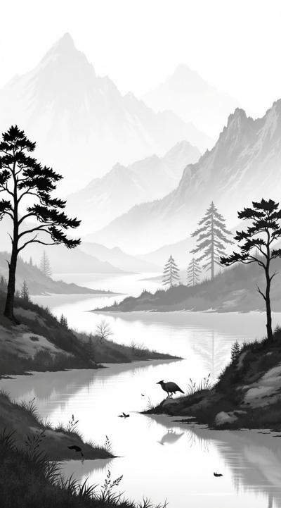 черно-белое изображение. весенний легкий пейзаж. ранняя весна. но без снега, атмосфера надежды. ощущение прохлады, резкости ветра, как бунтарства, на изображении вода, деревья, трава и горы, Фон сжатый, горы близко, без ощущения огромного расстояния., Никакой панорамы, никакого широкого пейзажа., Пространство плотное, сжатое, напряжённое., Весна ощущается физически — холодный ветер, движение, сопротивление., Чёрно-белая графика, резкие мазки, сильное ощущение движения.