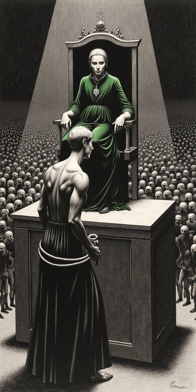 Гравюра, чёрно-белая. На помосте — мужчина под плетьми, смотрит на ложу. В ложе — девушка в зеленом королевском бархатном платье, лицо — спокойное, холодное маска, но пальцы впились в трон. Их взгляды встречаются — ось тихой ярости. Толпа — безликая тень на заднем плане. Только контраст, напряжение и диалог взглядов.