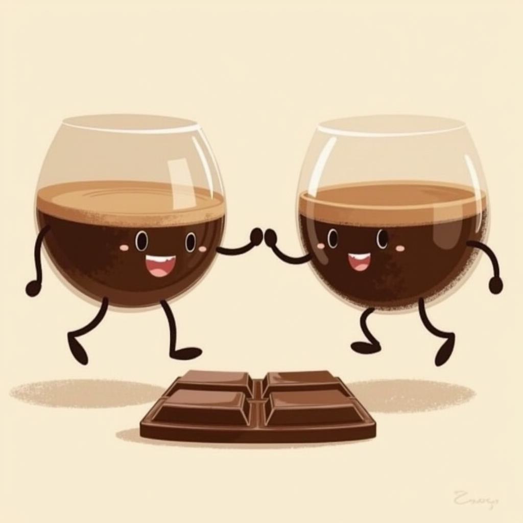 Два бодрых эспрессо с улыбками до ушей, глазками‑пуговками и крошечными ручками и ножками замечают, что к ним идёт кто‑то особенный. Это плитка молочного шоколада! У неё тоже есть ручки и ножки, и она улыбается так лучезарно, что эспрессо тут же начинают подпрыгивать от нетерпения. Шоколад подмигивает им и говорит: «Ну что, готовы к идеальному сочетанию?» Эспрессо хором отвечают: «Да!» — и бегут навстречу.