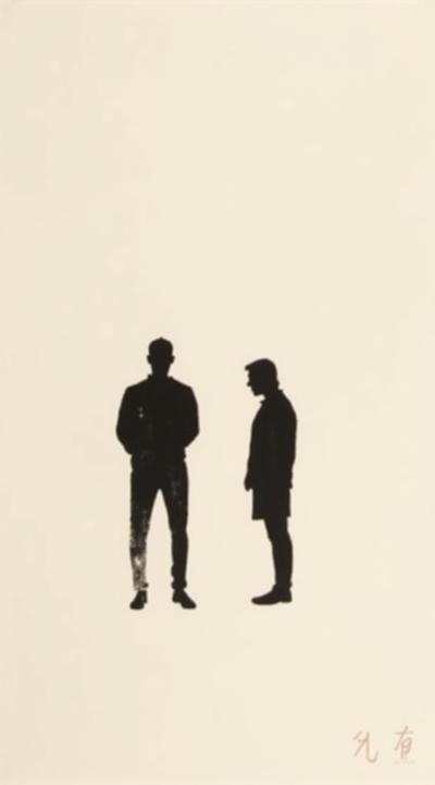 Минималистичная графика, тушь, экстремальный контраст. Два человеческих силуэта стоят друг напротив друга, разделенные широким пустым пространством., Левый силуэт (мужской): Высокий, широкоплечий. Состоит из вертикальной штриховки, как сдерживаемый голод. Слегка наклонен вперед, как будто собирается перейти в наступление., Правый силуэт (женский): Минимально отклонен назад, как будто собирается отступить. Статика оцепенения и отзыва., Пространство между ними: Широкая полоса чистого белого. , Глубокий черный фон. Ни лиц, ни деталей — только форма, поза и ощутимое немое желание.