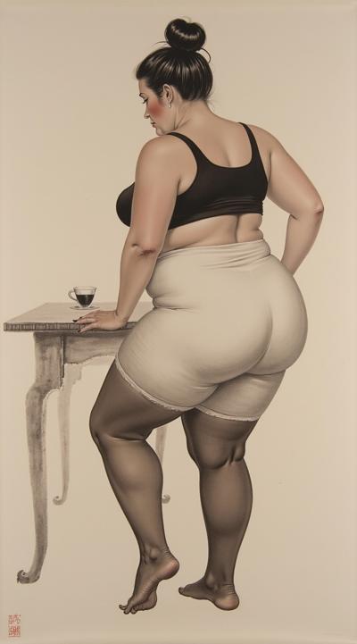 наложение фонов, двойная экспозиция, картина с прозрачной импрематурой, вид сбоку, толстая толстозадая разжиревшая красивая дама 50 лет, в белых вискозных облегающих обтягивающих труселях-панталонах до колен, в чёрном лифчике,в коричневых чулках, нагнулся над столом, пышные большие бёдра, огромная широкая толстая круглая задняя часть, фривольная фотографическая открытка начала 20 века, в стиле Рембрандта, UltraHD