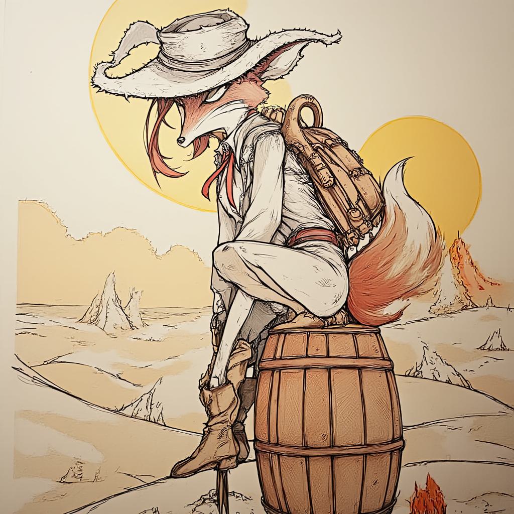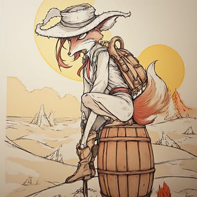 Гуашь, плотные мазки. Антропоморфная девушка лиса-сталкер в элегантном, поношенном костюме и старой шляпе из под шляпы выбиваются рыжие волосы повязанные лентой , рюкзак, сидит на бочке. , Фон: солнечный, пляж лазурный берег, экспрессивные тени. Костер – пятно чистого оранжевого света. Насыщенные, матовые цвета, эффект текстуры краски. Стиль гуашь акварель