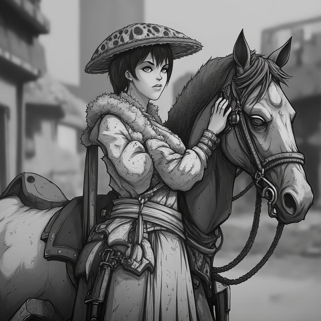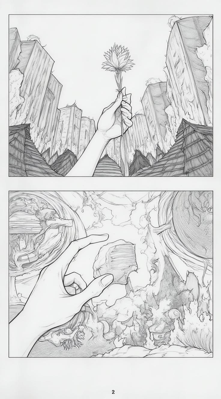 Символическая черно белая гравюра, разделённая на два плана. Драматический контраст близкого жеста и далёкого разрушения., Передний план:, Женская рука (тонкая, с изящными, но напряжёнными пальцами) держит цветок на стебле. Цветок горит. , Задний план: силуэты горящих домов. Не детальные, а размытые, как кошмар обрушенные крыши, остовы башен., Высококонтрастная гравюра. Только чистый чёрный, белый и агрессивная штриховка.