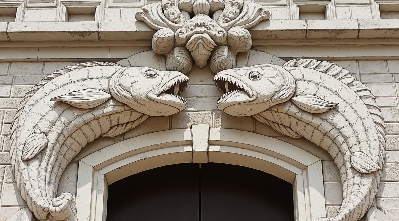 Декоративное верхняя часть наличника в которой две рыбы напротив друг друга мордами в стиле средневековья