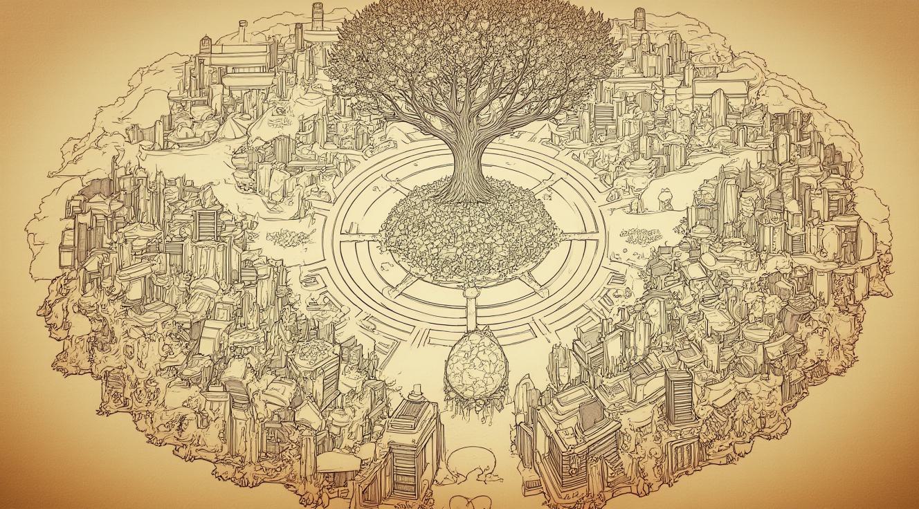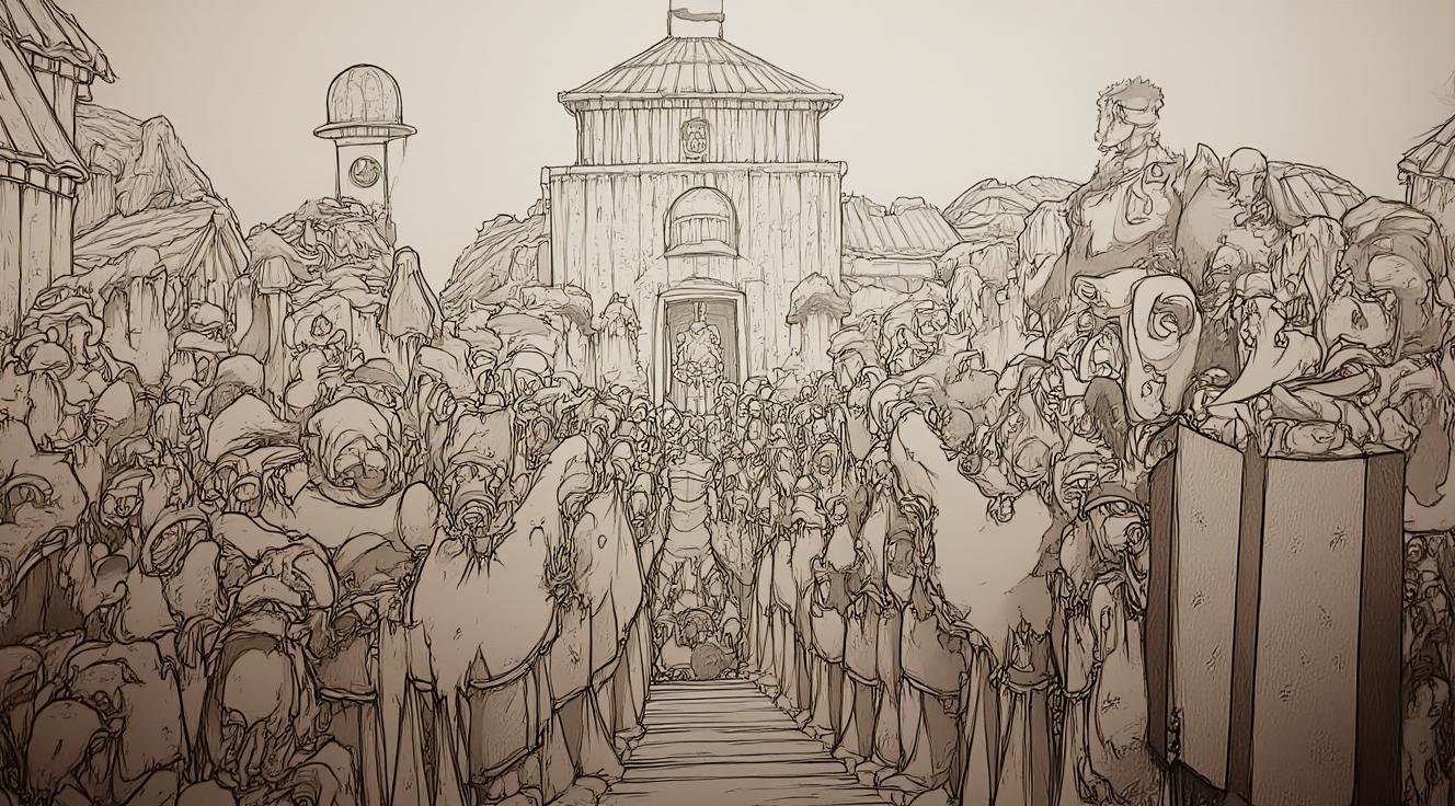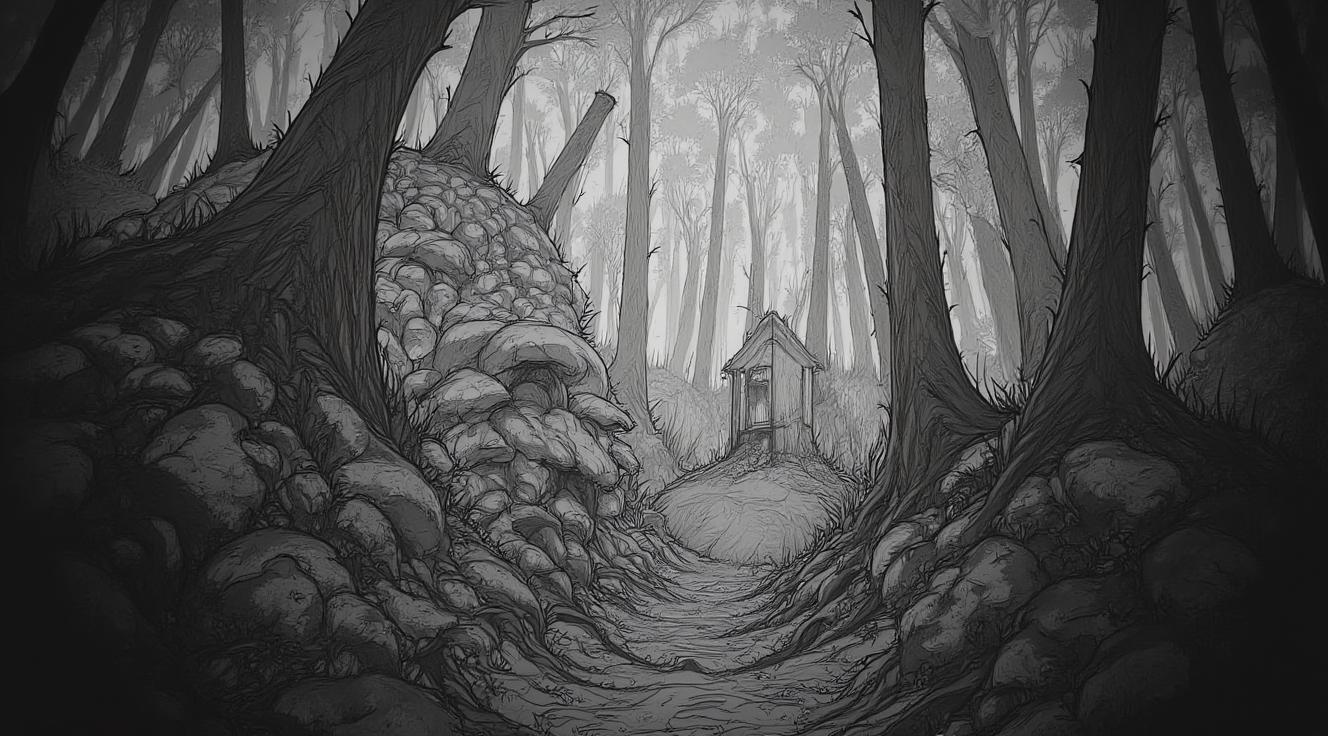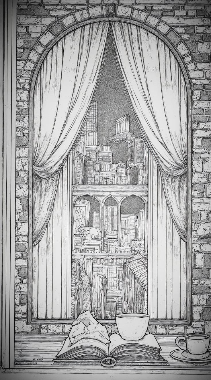 Книжная гравюра. Высокое арочное окно, занимающее почти весь кадр. На окне легкие занавески. За ними почти ничего не видно, но понятно что снаружи средневековый город, ночь и идет густой снег. На подоконнике — следы присутствия: две недопитые чашки чая, лежащая книга., Акцент на книгах и чашке!, атмосфера - Уют, безопасность, созерцание.