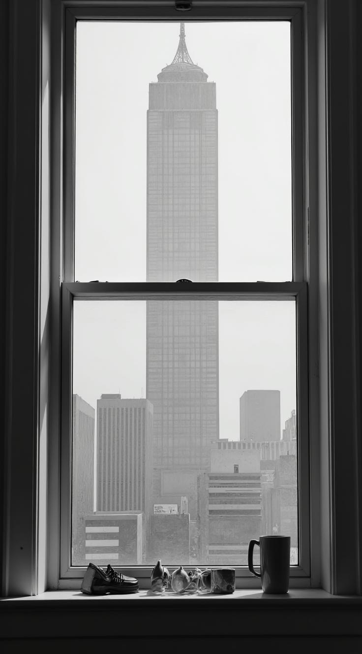 Вид изнутри комнаты., Композиция и ракурс:, Крупный план на подоконнике. Высокое окно занимает весь задний план, но оно сильно расфокусировано. Мы смотрим на него со стороны комнаты, и кадр построен так, что подоконник с предметами находится вплотную к "зрителю", занимая нижнюю половину изображения., , Окно — это световой фон. За ним виден лишь смутный, мягкий силуэт заснеженных крыш города и неба, без деталей., На широком деревянном подоконнике лежат:, , Две фарфоровые чашки, Раскрытая книга лежит рядом.