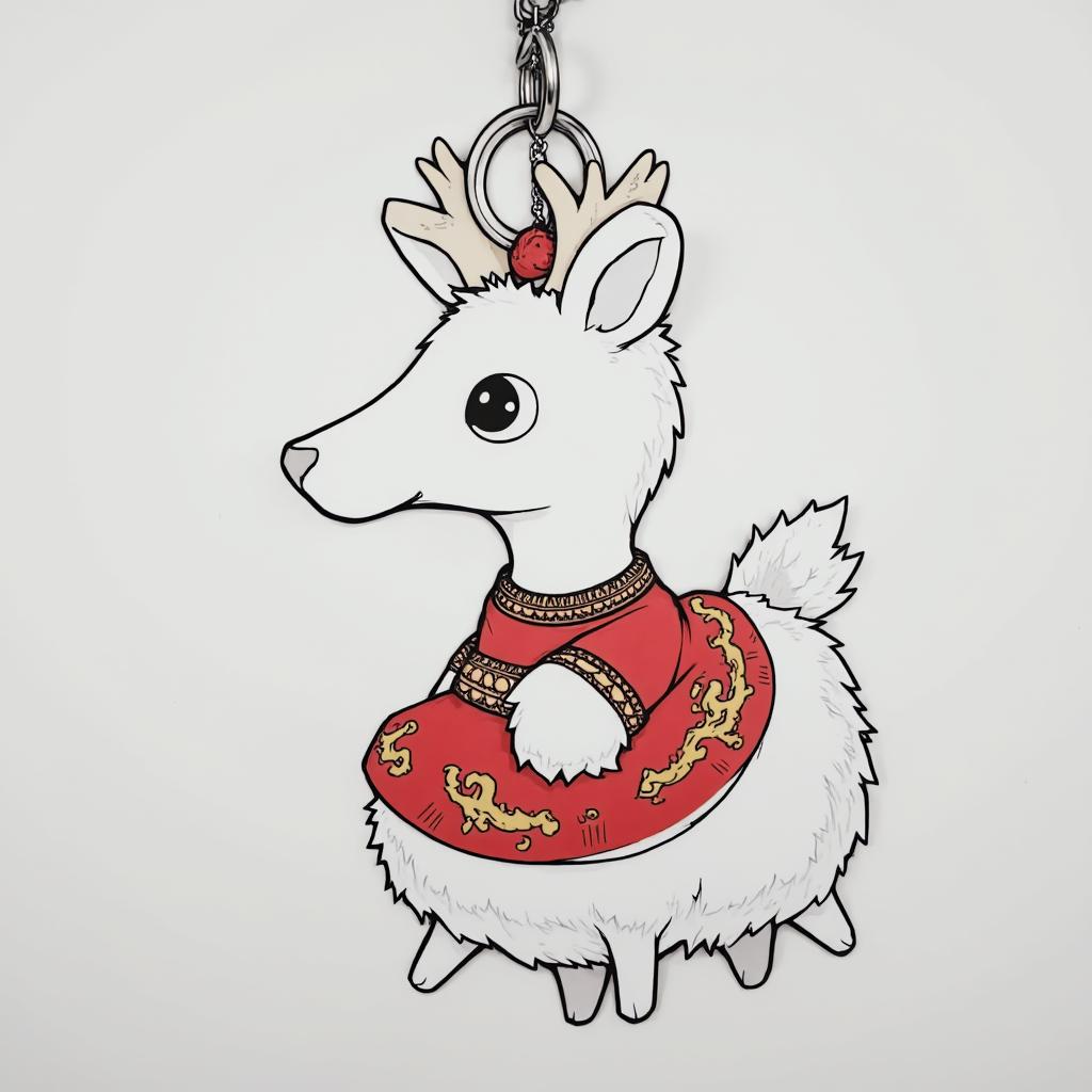 Мягкая игрушка на брелке белого оленя в национальной одежде Чукчей. В милом стиле рисунок