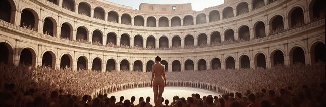 Полный людей колизей, в центре стоит девушка и оголяется, вид со спины