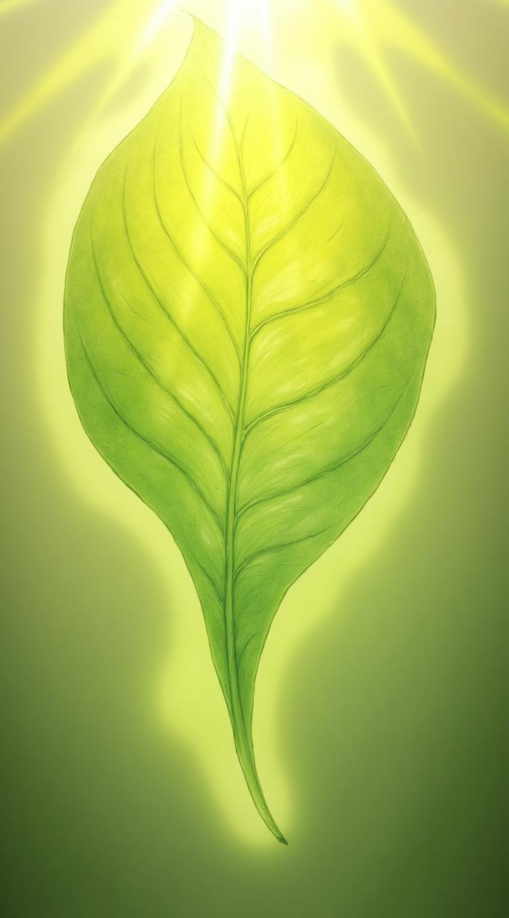 A large magical leaf covering the upper two-thirds of a vertical mobile screen, soft fantasy style, warm sunlight, gentle gradients, natural leaf texture with subtle veins, slightly glowing edges, organic curved shape, pastel green and yellow tones, soft ambient mist, fits into a cozy fairytale world with a giant ancient tree and stone cottages, high resolution, transparent background.,