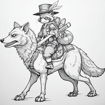 , Стиль акварель гуашь Фурри-арт , Антропоморфный Енот-сталкер одетый в старую униформу на голове шляпа с пером, на поясе подсумки и сзади рюкзак, (енот улыбается) Он сидит в седле, на волке-мутанте, у волка огромные когти и красные глаза, , (Енот вооружен саблей и держит ее в руке готовый к бою, ). Фон лес сосны-березы цветущие цветочками ромашки , , Стиль Акварель гуашь