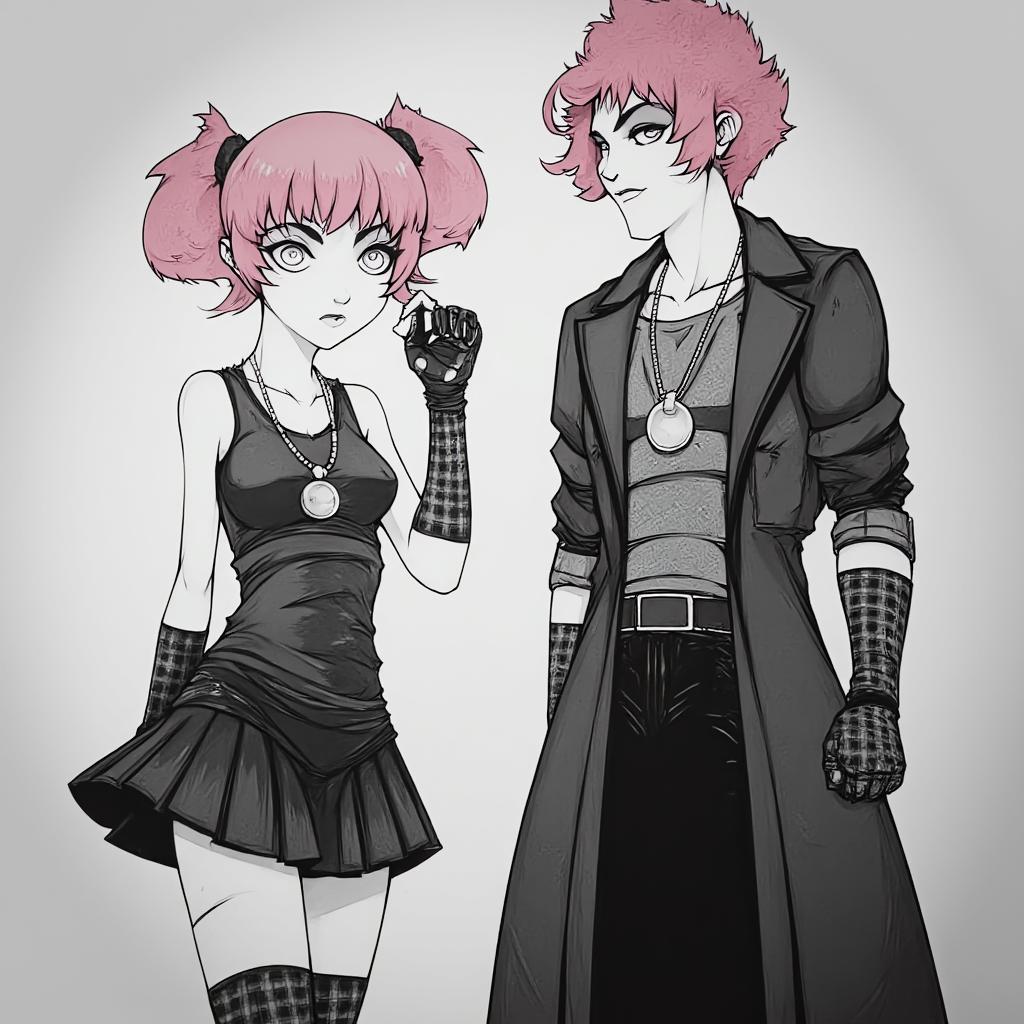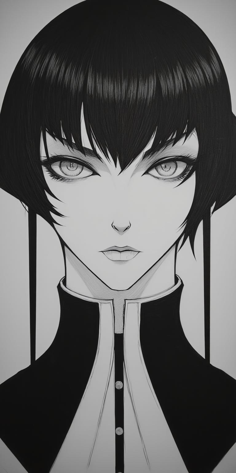 The image is a close-up portrait of a young woman's face. She has a serious expression with her eyes looking directly at the camera. Her hair is styled in a short, layered bob with a side part that falls over her shoulders. She is wearing a black and white outfit with a high collar and long, dangling earrings. Her makeup is subtle and natural-looking, with a hint of pink lipstick. The background is a plain grey color, making the woman the focal point of the image.