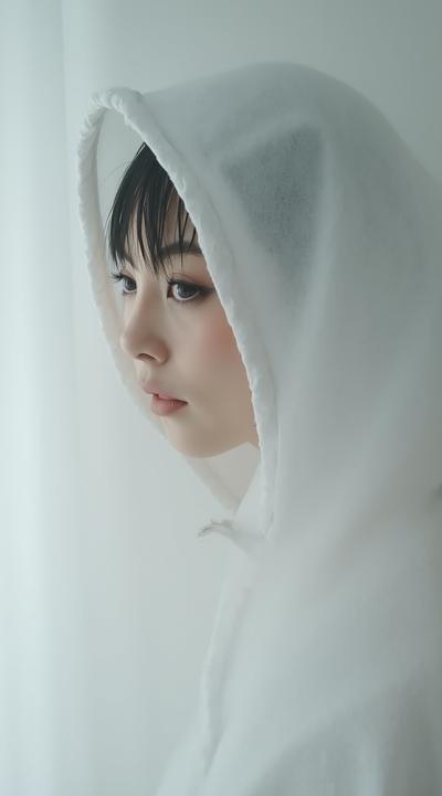 Девушка - сон, воспоминания,нежная и хрупкая азиатка,в белом худи, полупрозрачная, лиминальные пространства, японская купальня, внутри помещения,туман