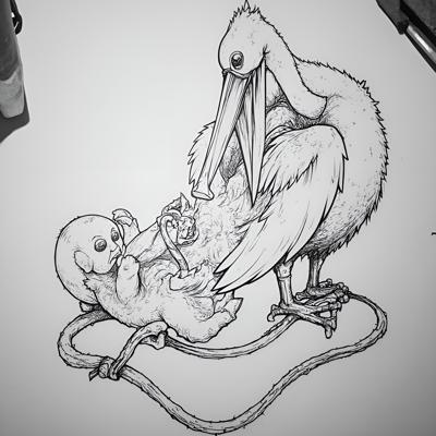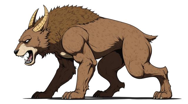 нарисуй оборотня - человек с головой медведя скалит зубы, с рогами козла, мускулистые руки и широкие плечи, всё тело покрыто густой бурой шерстью, стоит на четвереньках в боевой позе, выгнув большую мускулистую спину, вид сбоку
