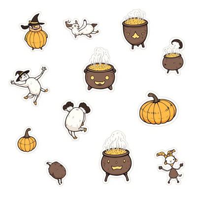 Нарисуй набор стикерпака. Каждый стикер должен быть на белом фоне. Рисовка hand-draw: уютная, милая. Цвета используй те, что ассоциируются с осенью. Тема стикеров: Хэллоуин. Стикеры: ведьмин котел