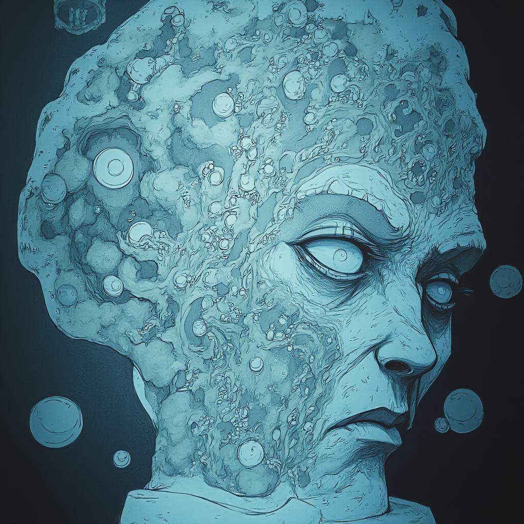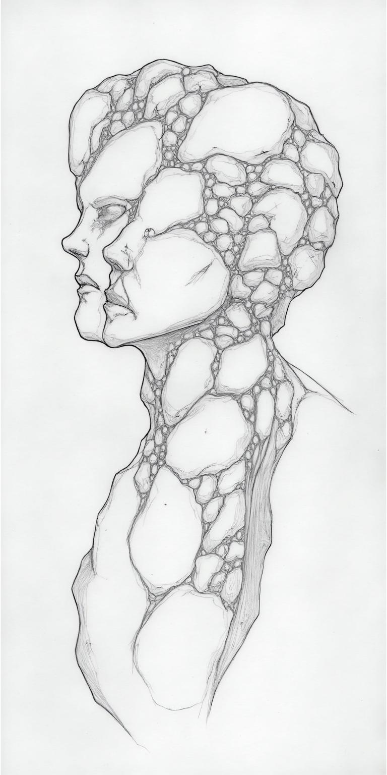 , Черно-белая экспрессивная линейная графика с фрагментированной скульптурой женского бюста, концептуальный рисунок в стиле современного искусства, четкие контурные линии, минимум деталей, без растушевки, без градиентов, без текстурного шума, элегантное негативное пространство, эмоциональная композиция, нарушенная анатомия, выраженная простыми четкими контурами, эстетика плаката для галереи, изысканный минимализм, художественная иллюстрация, чистые черные чернила на белом фоне
