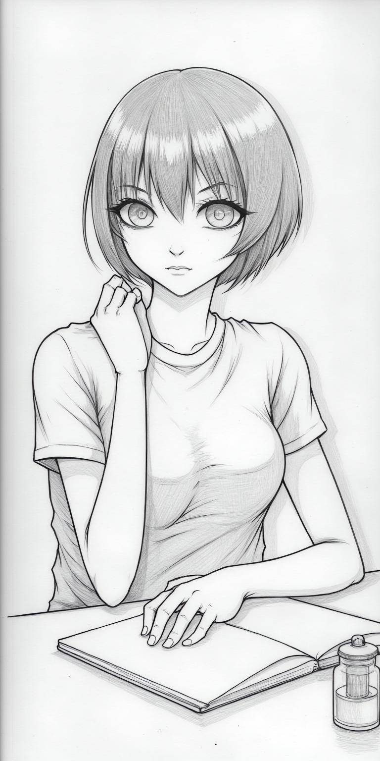 Реалистичный рисунок карандашом, аниме девушка с короткими волосами в блокноте на фоне стола