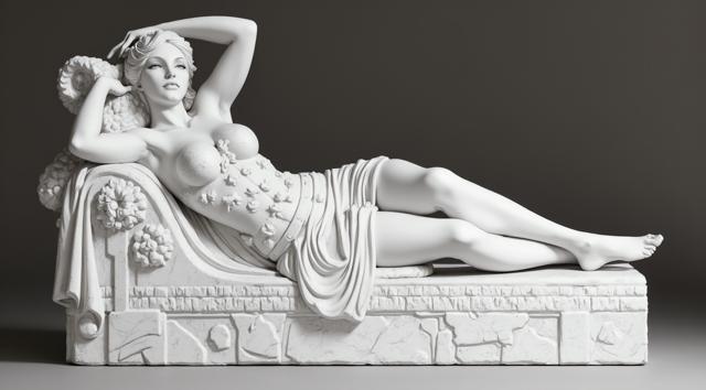 Скульптура из мрамора лежащей девушки в доспехах валькирии в мастерской художника