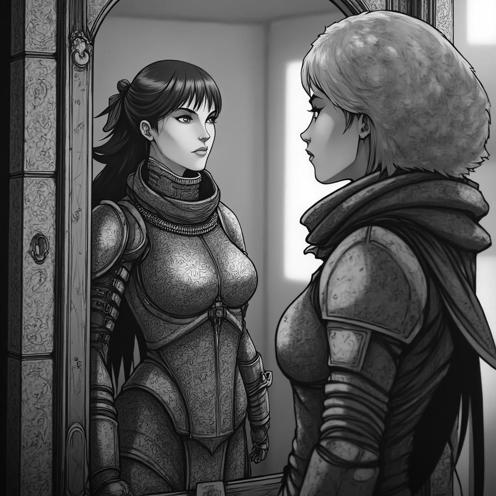 Девушка в бронекостюме смотрит в зеркало и видит своё отражение в виде бабушки в таком же бронекостюме