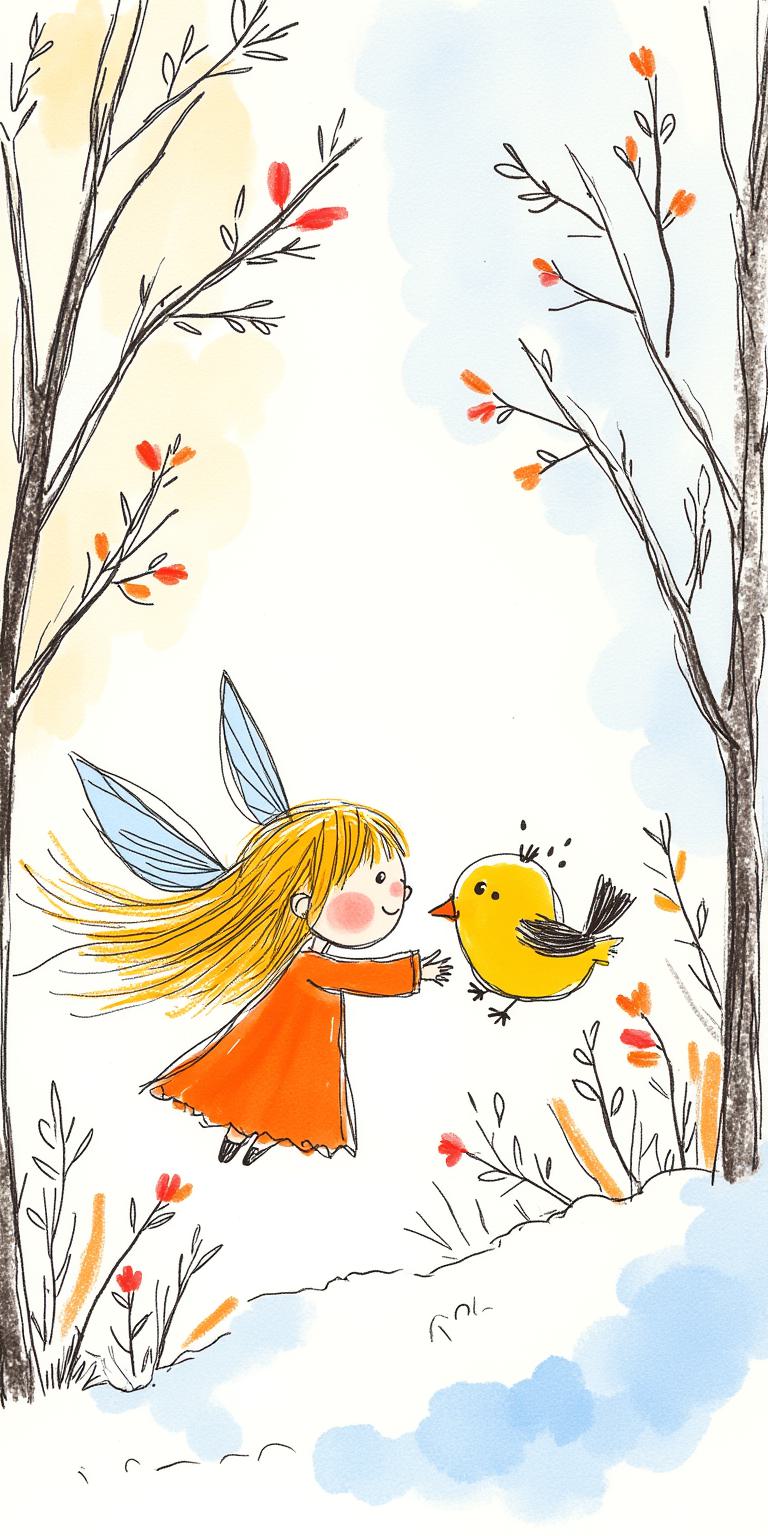 Акварельная иллюстрация, открытка на 8 марта, видимая текстура бумаги. Весна, тающий снег, проталины, первые цветы, почки на деревьях. Размытый фон. Солнечный свет. Маленькая фея с золотыми волосами радостно летает рядом с маленькой радостной птичкой. Они игриво касаются друг друга, видно, что они любят друг друга. Фея и птичка символизируют двух подруг, теплые и крепкие дружеские отношения. Нежность и теплота. Мягкие пастельные тона, голубой, белый, золотой. Формат вертикальный.
