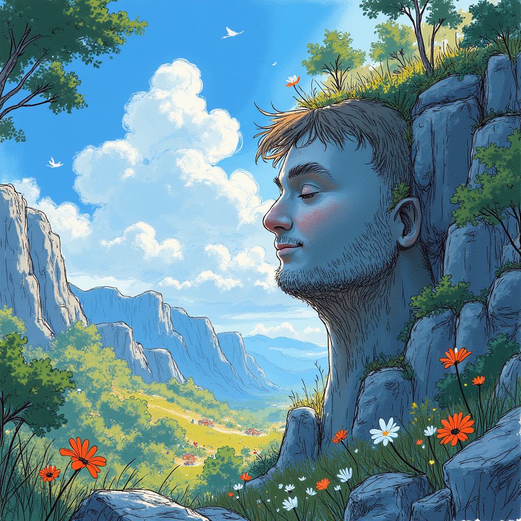 Волшебный пейзаж для детской сказки. Гигантский утес, похожий на древнего великана, в расщелине которого растут светящиеся цветы. По его каменной щеке скатывается одна бриллиантовая капля росы. В небе далеко-далеко улетает сияющая тучка-путешественница. Стиль волшебного реализма, мягкое освещение, глубокие цвета.