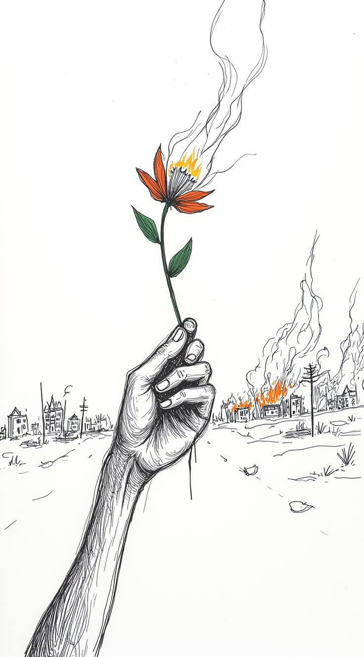 Символическая черно белая гравюра, разделённая на два плана. Драматический контраст близкого жеста и далёкого разрушения., Передний план:, Женская рука (тонкая, с изящными, но напряжёнными пальцами) держит цветок на стебле. Цветок горит. , Задний план: силуэты горящих домов. Не детальные, а размытые, как кошмар обрушенные крыши, остовы башен., Высококонтрастная гравюра. Только чистый чёрный, белый и агрессивная штриховка.