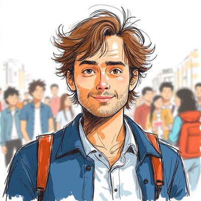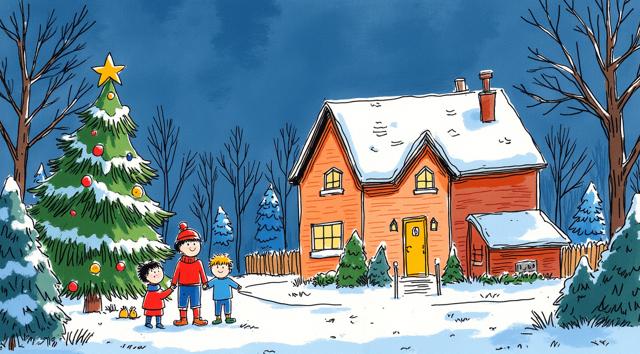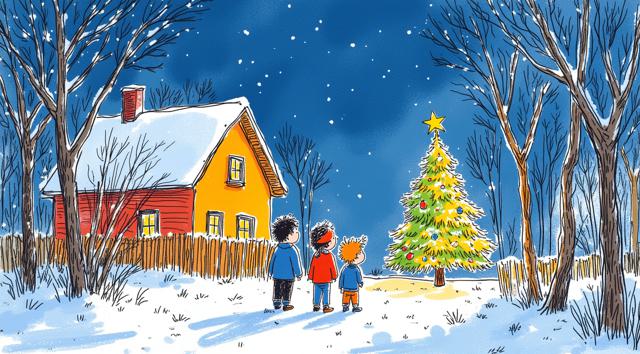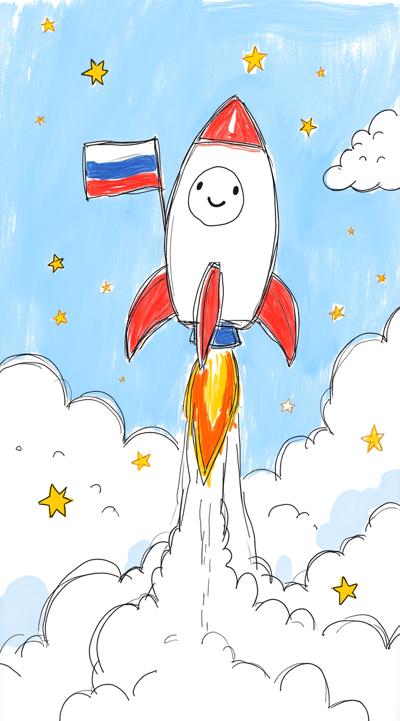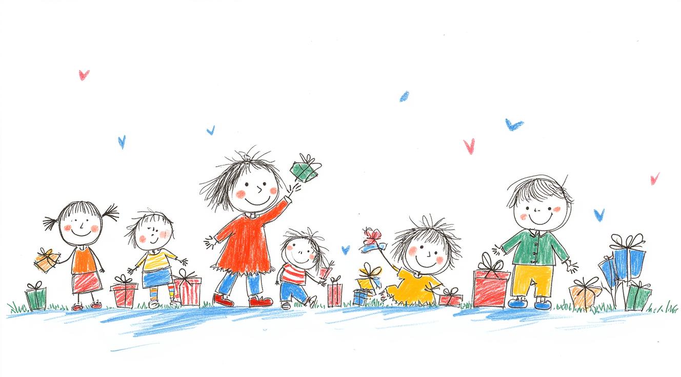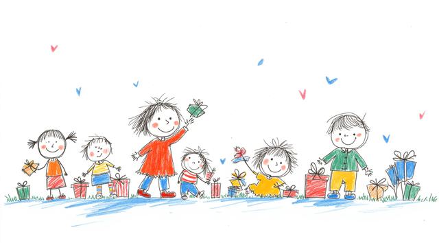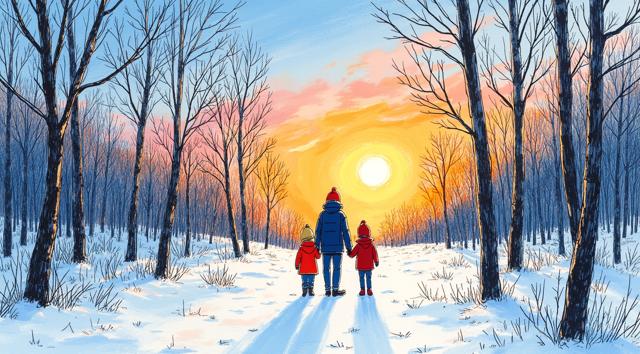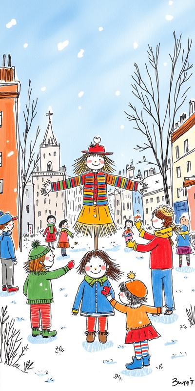 children and adults celebrating against the backdrop of an urban landscape with historical buildings and a snowy landscape. The main object is a spring scarecrow with bright ribbons and a colorful outfit, symbolizing the end of winter. Children hold musical instruments and ornaments in their hands, joyfully participating in the celebration. Clear lines and bright colors create an elegant and lively image style. The bright sky highlights the festive atmosphere, and soft shadows add depth to the composition. The dynamic poses of the characters reflect joy and fun.