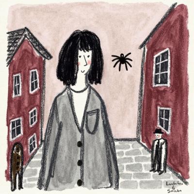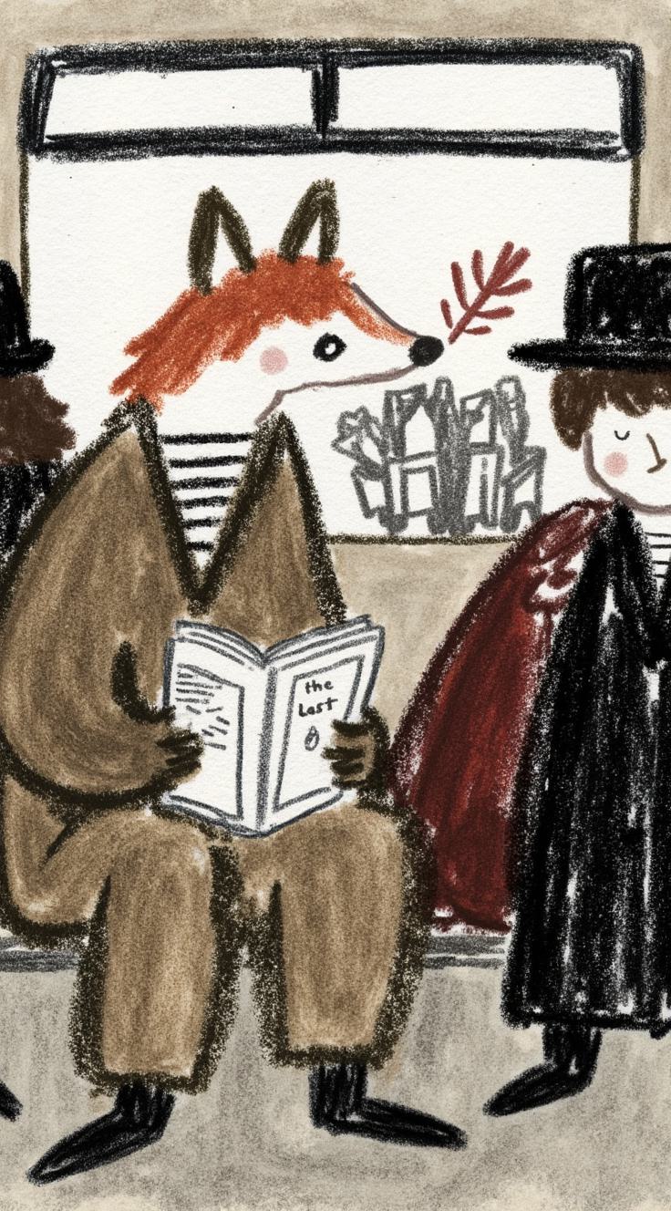 Лиса в тренче сидит в подземке, держит газету “Последний поезд”. Остальные пассажиры — размытые тени. В отражении на окне — она ребёнком бежит по осеннему лесу. Между лап — одна красная осенняя листва. Стиль филм-нуар, сюрреализм, меланхолия, чёрно-белое с одной красной деталью, кинематографично, 4K,