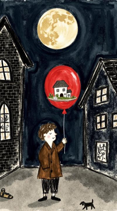 Мальчик в поношенном пальто держит красный шарик на тёмной городской улице. Внутри шара — его мечты: дом с садом, собака, улыбающаяся мать. Внизу — реальность: разбитые окна, граффити, потерянная туфля. Над ним — полная луна. Несколько реальностей в одном кадре, филм-нуар с магическим реализмом, высокий контраст, эмоционально, чёрно-белое с красным шариком, кинематографично, 4K
