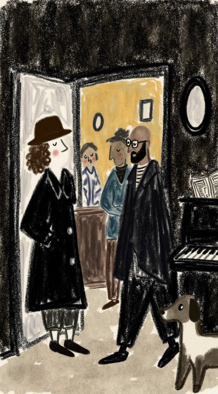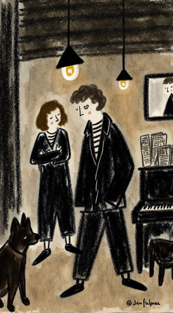 Тускло освещённый бар в подвале, дым, тени. Каждый посетитель — чья-то тень: женщина с лицом ребёнка, мужчина с часами вместо головы, собака в очках, читающая газету. В углу — рояль играет сам. На стене — зеркало без отражений. Множество сюжетов в одном кадре, сюрреализм, чёрно-белое с тёплым светом, атмосфера филм-нуар, загадочно, 4K