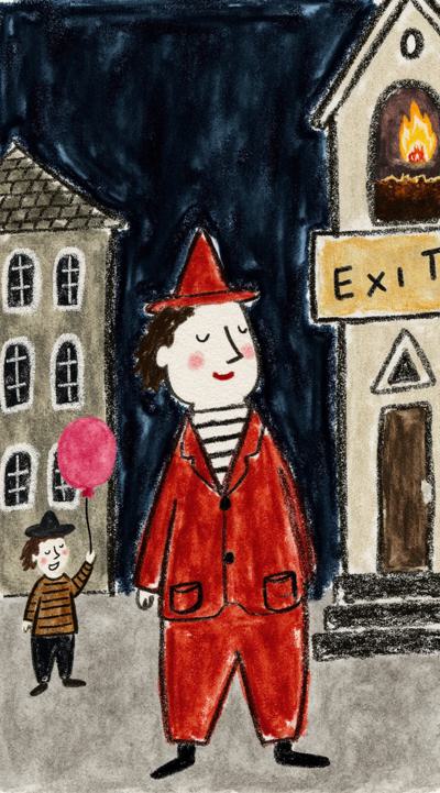 Грустный клоун в поношенном красном костюме стоит посреди мокрой ночной улицы, держит сдувшийся шарик. За ним — ребёнок смеётся в солнечном свете. Слева — пустой театр с горящей сценой. Справа — тень в окне наблюдает. Над ним — неоновая вывеска: “Выход”. Множество сюжетов в одном кадре, стиль филм-нуар, сюрреализм, чёрно-белое с одной красной деталью, кинематографично, 4K