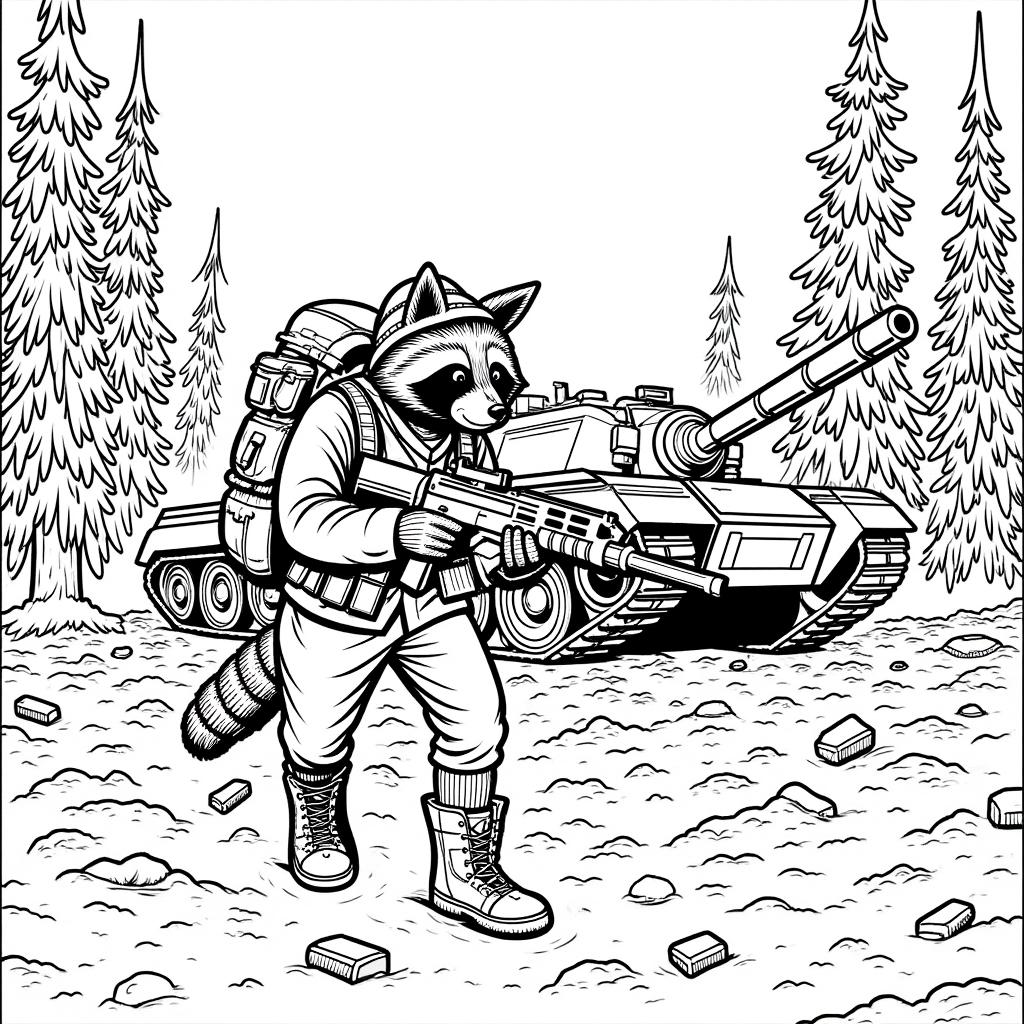 Енот-сталкер (он вооружен советским арбалетом ) ( он головном уборе и одежде не первой свежести в военных сапогах с подсумками и с рюкзаком) пробираются по темным, заваленным обломками . Пыль и обломки повсюду вокруг хвойный лес. (На фоне взорванный танк) Стиль: винтажная советская иллюстрация (60-80-е), густая черная обводка, плоская заливка гуашевыми цветами, условные тени, Эффект вырезки из старой книги, с характерной текстурой потертой бумаги.”