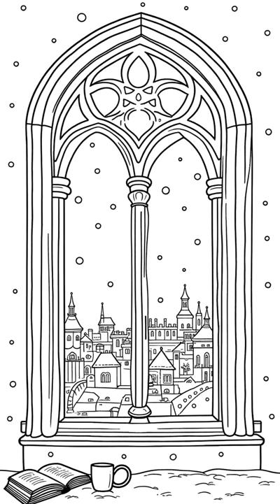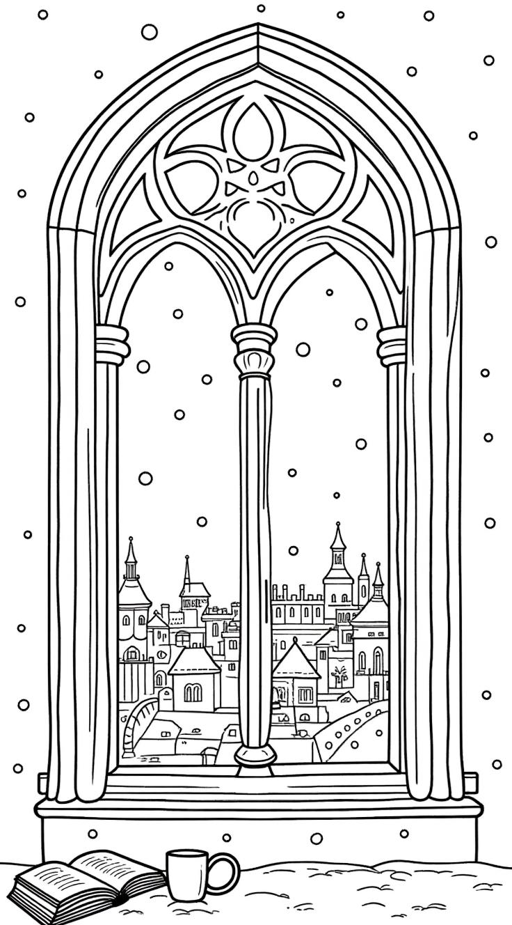 Книжная гравюра. Высокое арочное окно, занимающее почти весь кадр. На окне легкие занавески. За ними почти ничего не видно, но понятно что снаружи средневековый город, ночь и идет густой снег. На подоконнике — следы присутствия: две недопитые чашки чая, лежащая книга., Акцент на книгах и чашке!, атмосфера - Уют, безопасность, созерцание.