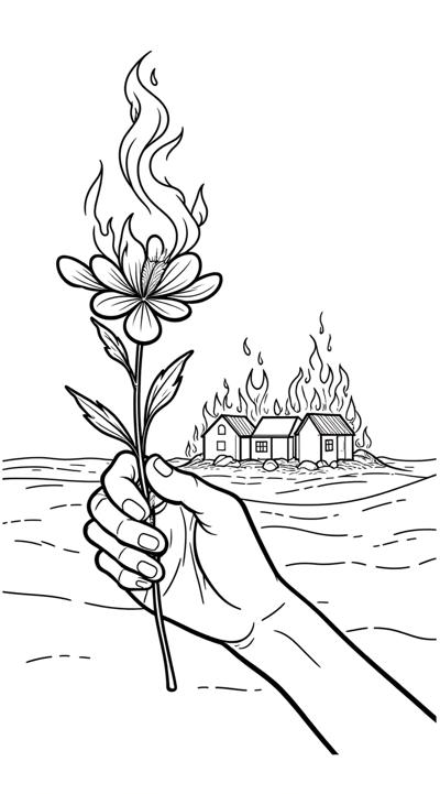 Символическая черно белая гравюра, разделённая на два плана. Драматический контраст близкого жеста и далёкого разрушения., Передний план:, Женская рука (тонкая, с изящными, но напряжёнными пальцами) держит цветок на стебле. Цветок горит. , Задний план: силуэты горящих домов. Не детальные, а размытые, как кошмар обрушенные крыши, остовы башен., Высококонтрастная гравюра. Только чистый чёрный, белый и агрессивная штриховка.