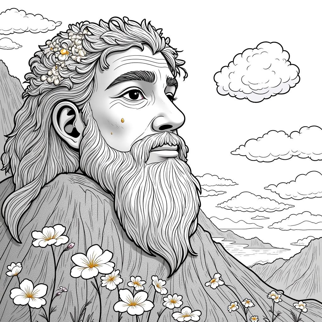 Волшебный пейзаж для детской сказки. Гигантский утес, похожий на древнего великана, в расщелине которого растут светящиеся цветы. По его каменной щеке скатывается одна бриллиантовая капля росы. В небе далеко-далеко улетает сияющая тучка-путешественница. Стиль волшебного реализма, мягкое освещение, глубокие цвета.