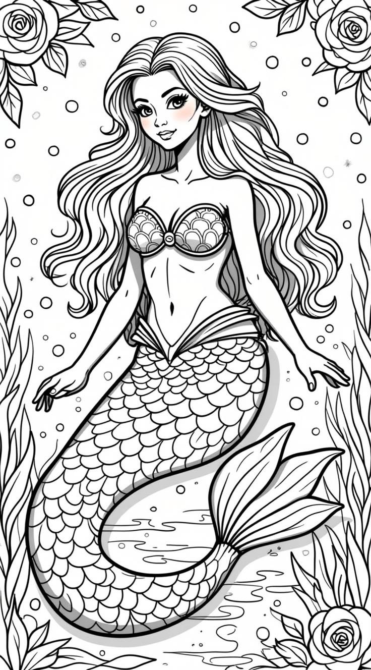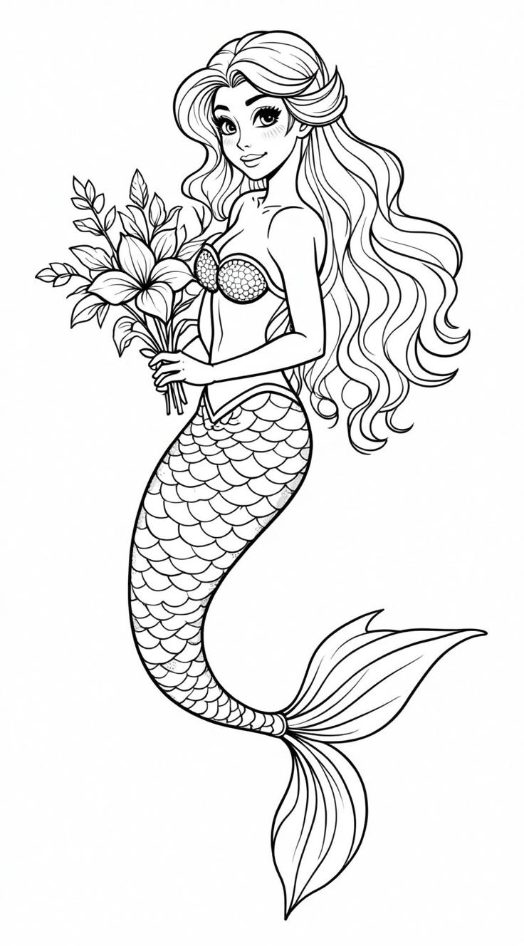Раскраска красивая русалка держит в руках цветы