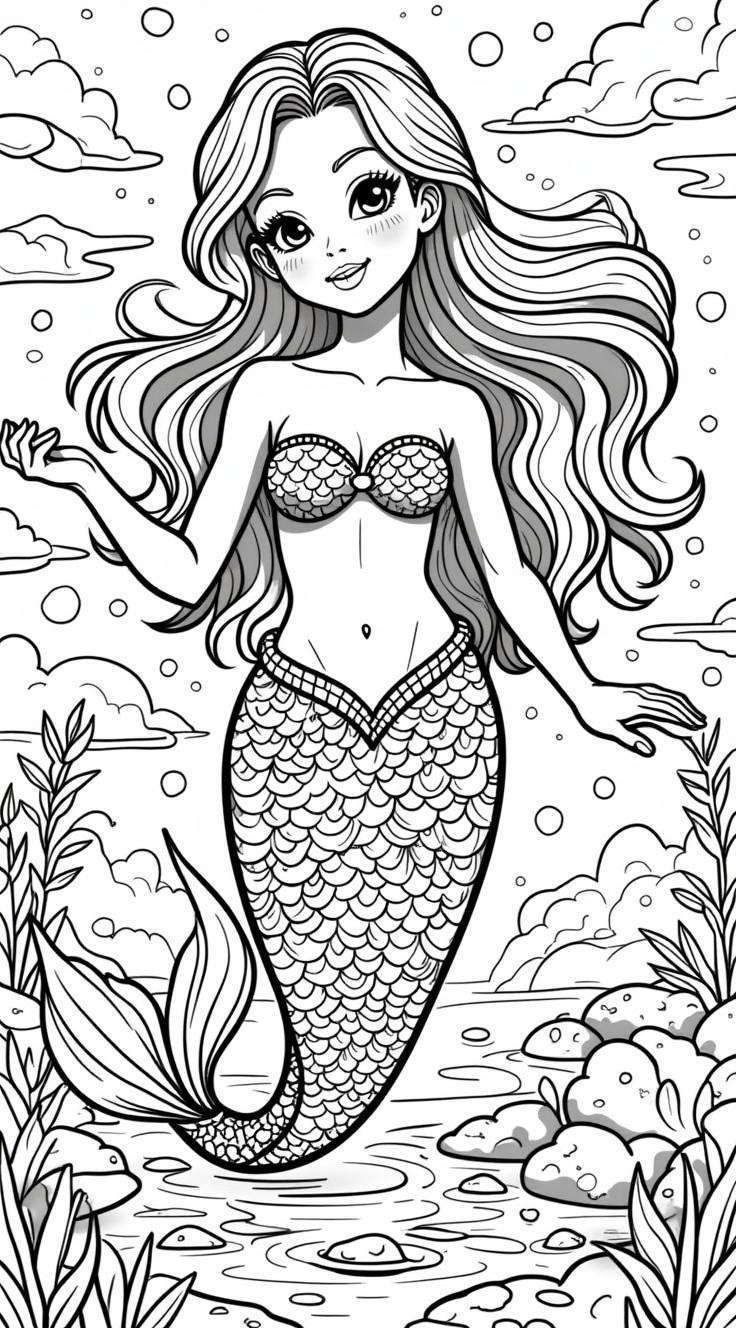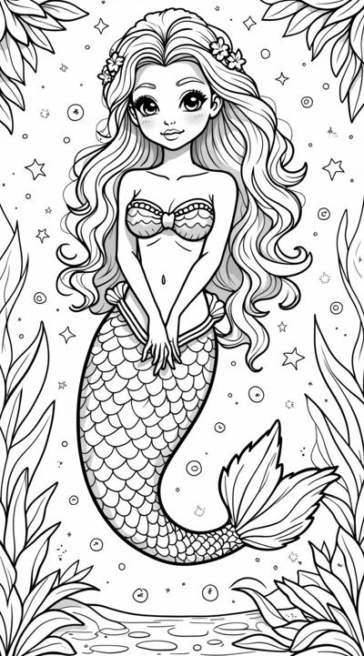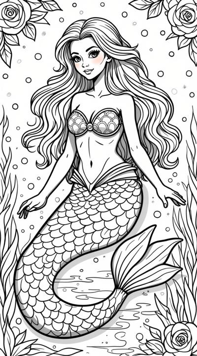 Русалка красивая с узорами и цветами зентанг раскраска