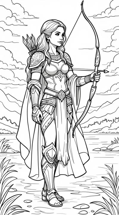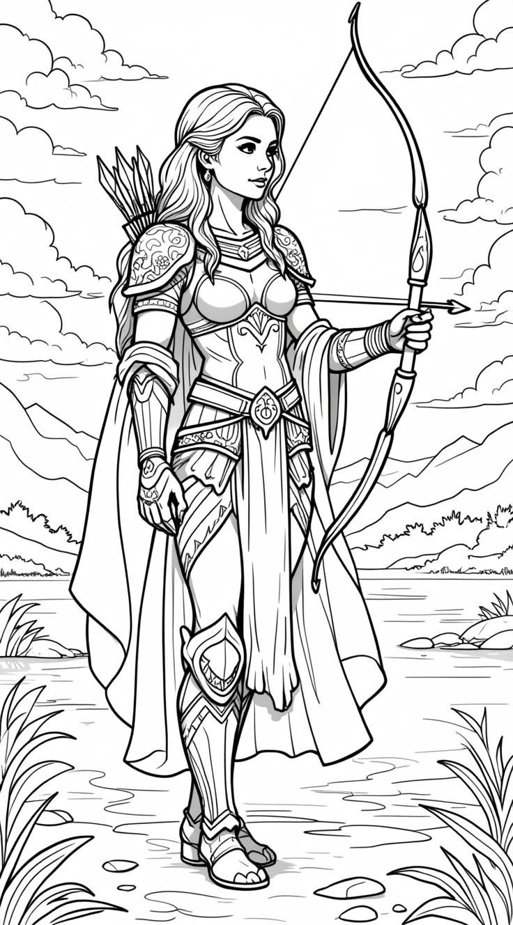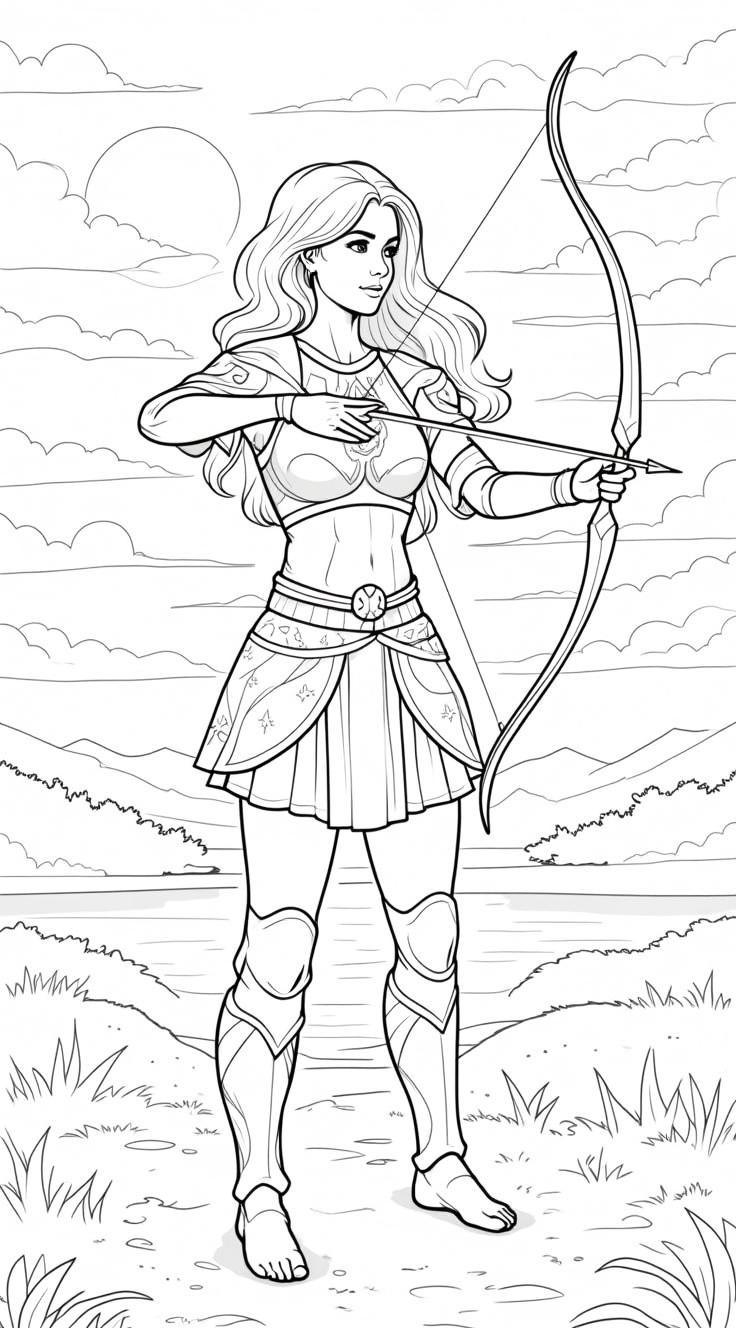 Девушка в красивых узорчатых доспехах на восходе с луком и стрелами