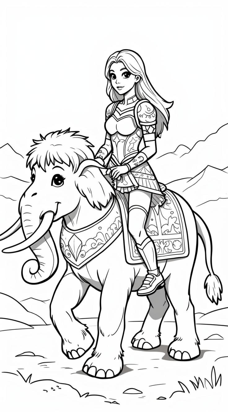 Девушка в красивых узорчатых доспехах на мамонте