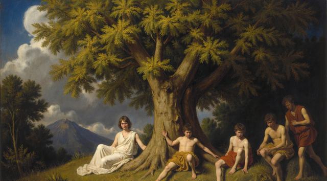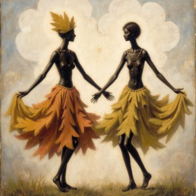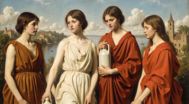 СРЕДНЕВЕКОВАЯ КАРТИНА . ФОН КАРТИНЫ НЕЖНО ОРАНЖЕВО БИРЮЗОВЫЙ . ПАНОРАМА С ВИДОМ НА БОЛЬШУЮ РЕКУ С БЕРЕГАМИ , ЛОДКАМИ , ЦЕРКВЯМИ И ДОМАМИ . ЧЕТЫРЕ ЖЕНЩИНЫ С БЕЛЫМИ КУВШИНАМИ В РУКАХ РАСПОЛОЖЕННЫ В ПРОФИЛЬ К НАМ . ОДНА ЖЕНЩИНА В БЕЛОМ САРАФАНЕ ОБНИМАЕТ ОДНУ ЖЕНЩИНУ . ТРИ ЖЕНЩИНЫ ОДЕТЫ В КРАСНЫЕ СРЕДНЕВЕКОВЫЕ ПЛАТЬЯ УКРАШЕНЫМИ ТЕМНО СИНИМИ ПТИЦАМИ НА ГОЛОВАХ КРАСНЫЕ СРЕДНЕВЕКОВЫЕ ШЛЯПЫ В РУКАХ И НА ГОЛОВЕ БЕЛЫЕ КУВШИНЫ . ФОН КАРТИНЫ НЕЖНО ОРАНЖЕВО БИРЮЗОВОЙ ПАНОРАМЫ С ВИДОМ НА БОЛЬШУЮ РЕКУ С БЕРЕГАМИ , ЛОДКАМИ , ЦЕРКВЯМИ И ДОМАМИ .