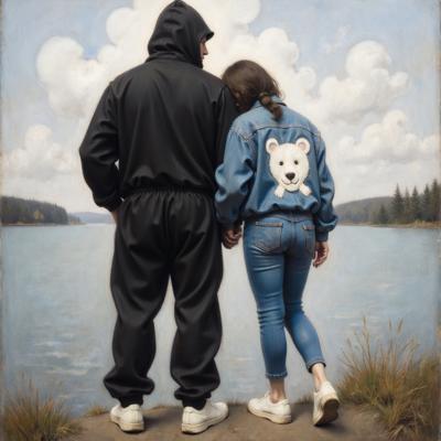 на берегу озера стоят мужчина плотного телосложения в черном спортивном костюме капюшон одет на голову мужчины мужчина держит за руку женщину женщина в джинсовке на спине джинсовка аппликация белый медвежонок на ногах джинсы и белые кроссовки женщина положила голову на плечо мужчине у женщины темные распущенные волосы до лопаток они смотрят на домик на другом берегу стоит домик
