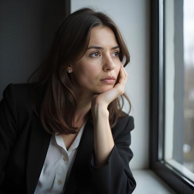 Photorealistic, close-up shot of a beautiful, tired businesswoman, 40 years old, in a modern minimalist office. She is resting her head on her hand, looking out the window with a thoughtful, exhausted expression. Soft, natural morning light. The style is professional, cinematic, muted tones. Sense of quiet stress and burnout. --ar 4:3 --style raw hopeful undertone