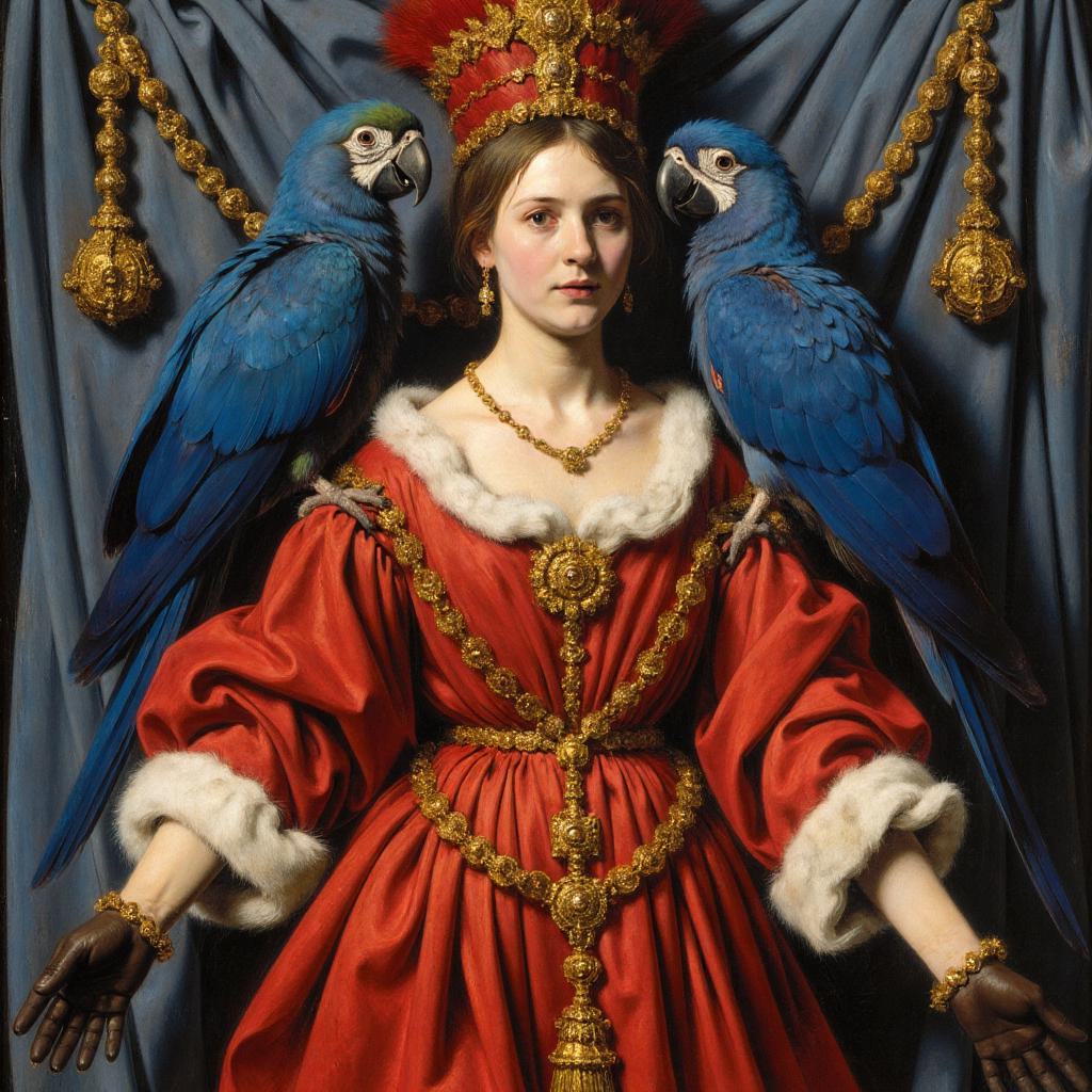 КЛАССИЧЕСКАЯ СРЕДНЕВЕКОВАЯ КАРТИНА . ЖЕНЩИНА В СРЕДНЕВЕКОВОМ ШИКАРНОМ КРАСНО ЗОЛОТИСТОМ ВЕНЕЦИАНСКОМ КАРНАВАЛЬНОМ ПЛАТЬЕ УКРАШЕННОЕ НА ТКАНИ ДВУМЯ БОЛЬШИМИ СИНИМИ ПОПУГАЯМИ НА ГОЛОВЕ СРЕДНЕВЕКОВЫЙ КРАСНО СИНЕ ЗОЛОТИСТЫЙ ГОЛОВНОЙ УБОР В ЧЕРНЫХ ПЕРЧАТКАХ НА ФОНЕ СИНЕГО ПОЛОТНА С БОЛЬШИМИ ЗОЛОТЫМИ ВЕРЕВОЧНЫМИ КИСТОЧКАМИ И УКРАШЕННОЕ КРАСНЫМИ ПОПУГАЯМИ