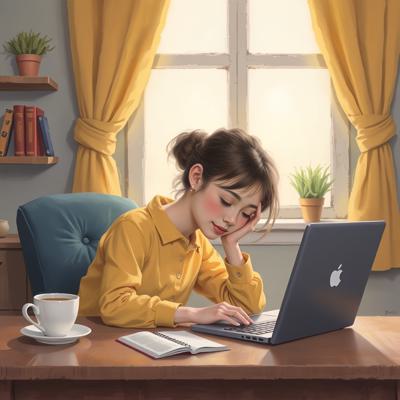 A cute, relatable cartoon style illustration of a tired office worker in a cozy home setting. The person is asleep at their desk, face down on the laptop keyboard, looking peaceful. A warm, soft morning light comes from the window. On the desk: a cup of coffee and a empty plate. The atmosphere is gentle, humorous, and sympathetic. Soft shadows, pastel color palette, vector art style.