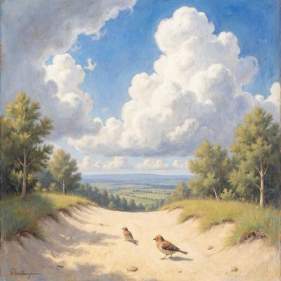 Создай акварельную иллюстрацию: светлое небо, разрывы облаков, солнечные блики, воробьи купаются в песке, завеса дождя, опушка леса в золотой пыли. Сгенерируй динамичную картину с эффектом приближающегося дождя, используя пастельные тона. Нарисуй весенний пейзаж с эффектом приближающегося дождя, где главные элементы — свет и движение