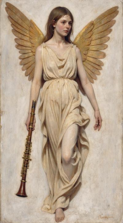 CMYK 255, стиль древней Месопотамии, наложение фонов, двойная экспозиция, крупный план, гибридизация гибрид кларнет single shot pistole с тонким длинным прямым стволом, телескопический ствол, фоном портрет Кары Делевинь в образе феи, зарисовка цветной тушью каллиграфичная техника по сырой штукатурке, максимализм реализм, насыщенность, контраст, необычный кинематографичный ракурс, детализация, сюрреалистичный digital art, UltraHD