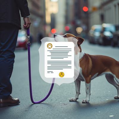 A conceptual image for a legal memo about pet laws. A close-up of a dog on a short leash next to a person's legs in a city environment. Superimposed semi-transparent icons of a shield with a paw print and a document with a seal. Cinematic lighting, realistic photography style, professional and serious atmosphere.