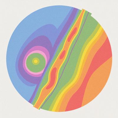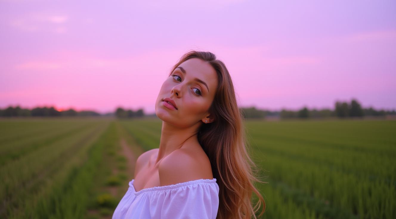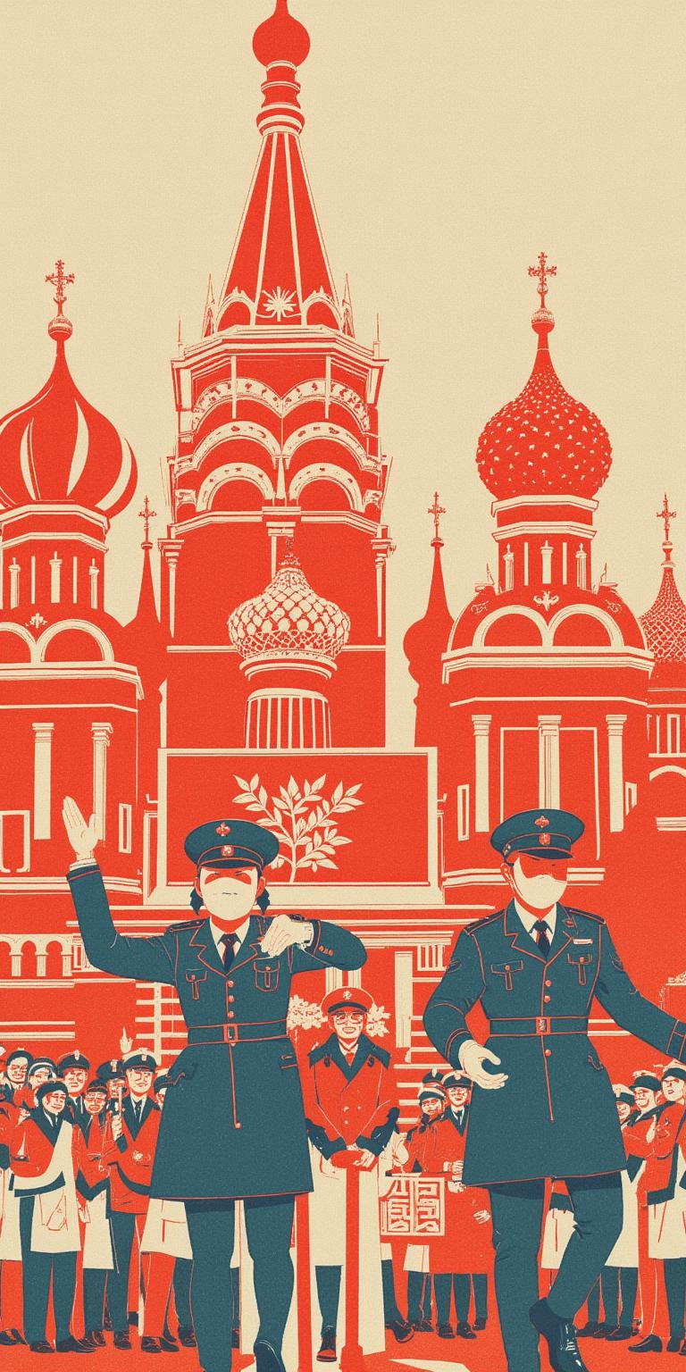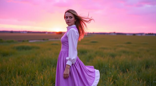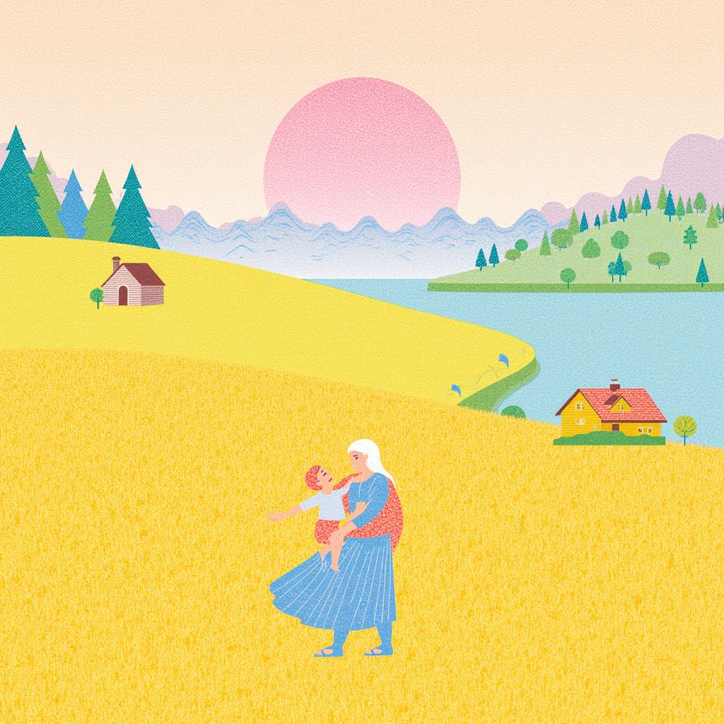 A detailed colored pencil illustration. A panoramic view: a vast golden wheat field under a warm sun, a calm lake, and a small wooden house by a forest. A central, gentle maternal figure (the spirit of the homeland) embraces a young man looking towards a horizon blending with subtle cosmic and oceanic motifs. Red banners wave in the sky. Children play in the foreground. The style is warm, textured, and nostalgic, evoking love and pride. Dominant palette: golds, greens, soft blues