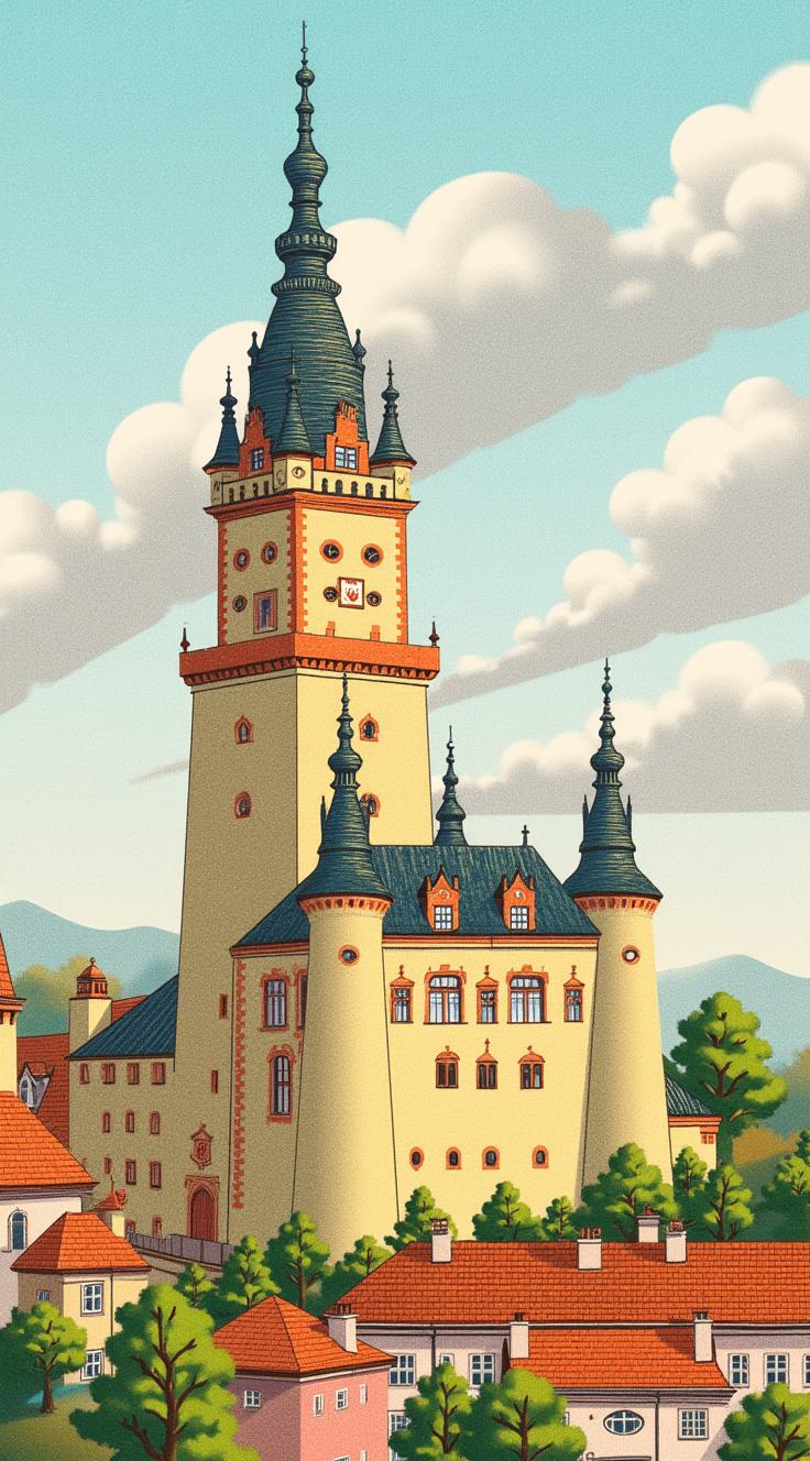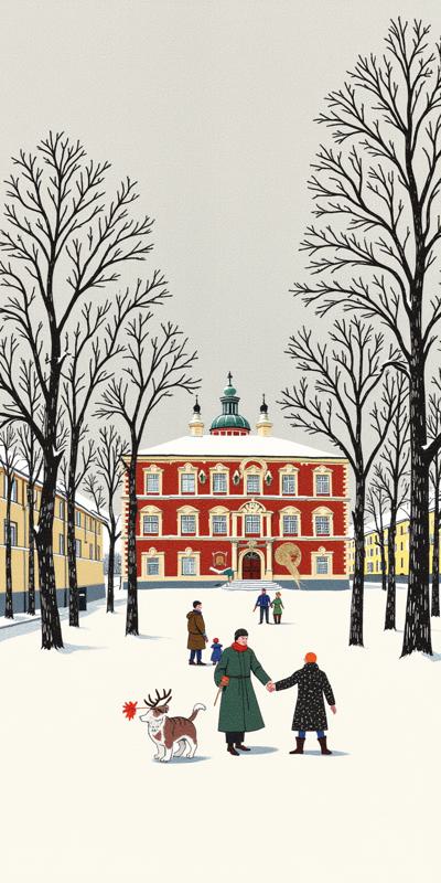 средневековый дворец в средневековом городе. дворец поражает своей высотой и стройностью. он как будто воздушный, тончайшие башни и резьба, красивейшие арки, множество архитектурных деталей, , вокруг дворца видно немного город, дома ниже чем дворец., на изображении красивейшая, спокойная, умиротворяющая зима. в башенке дворца свет и видно два силуэта, атмосфера покоя и уюта